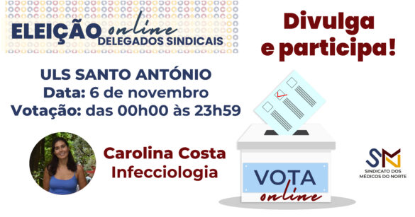 O SMN-FNAM informa que no próximo dia 6 de novembro decorrerá, em formato online, a eleição da Delegada Sindical do SMN na ULS Santo António. A candidata é a Dra. Carolina Costa, médica de Infecciologia, cuja dedicação e compromisso com a defesa dos direitos dos médicos e a qualidade do Serviço Nacional de Saúde são amplamente reconhecidos. Com esta eleição, o SMN reforça a sua representação sindical na ULS Santo António, que já conta com os seguintes Delegados: Ana Barbosa –...
